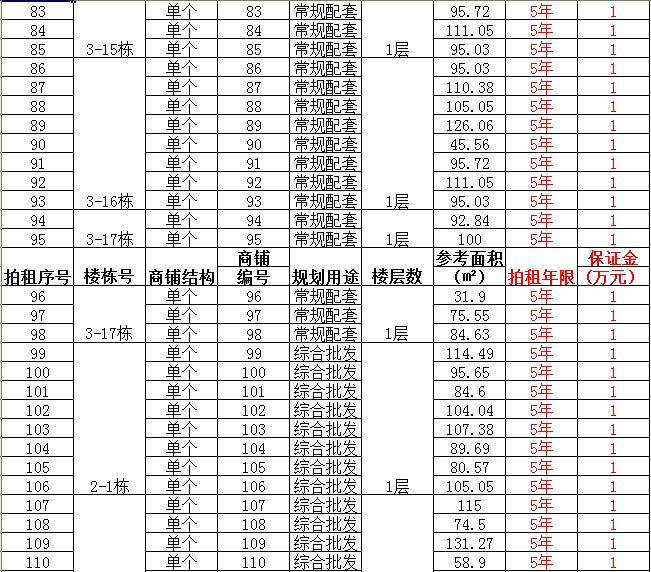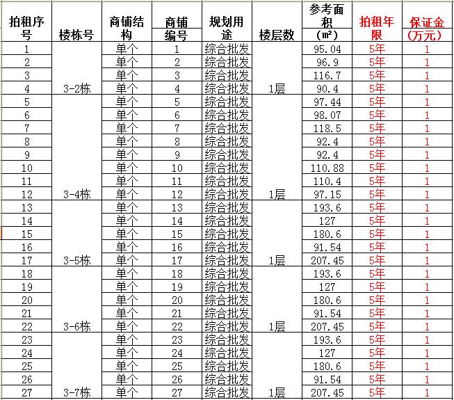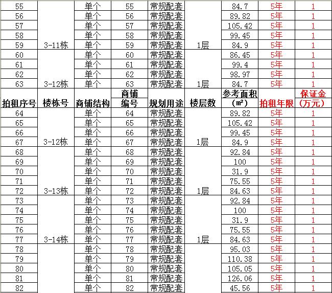 (一)拍租單個(gè)商鋪129間,使用期5年,每間商鋪預(yù)交競(jìng)租保證金1萬(wàn)元, 詳見(jiàn)商鋪簡(jiǎn)介(欲競(jìng)租多間商鋪,保證金類(lèi)推);